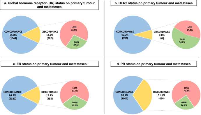 Expression of hormone receptor (HR) for estrogens (ER) and progesterone (PR) and HER2 remains the cornerstone to define the therapeutic strategy for breast cancer patients. We aimed to compare phenotypic profiles between matched primary and metastatic breast cancer (MBC) in the ESME database, a National real-life multicenter cohort of MBC patients. Patients with results available on both primary tumour and metastatic disease within 6 months of MBC diagnosis and before any tumour progression were eligible for the main analysis. Among the 16,703 patients included in the database, 1677 (10.0%) had available biopsy results at MBC diagnosis and on matched primary tumour. The change rate of either HR or HER2 was 27.0%. Global HR status changed (from positive = either ER or PR positive, to negative = both negative; and reverse) in 14.2% of the cases (expression loss in 72.5% and gain in 27.5%). HER2 status changed in 7.8% (amplification loss in 45.2%). The discordance rate appeared similar across different biopsy sites. Metastasis to bone, HER2+ and RH+/HER2- subtypes and previous adjuvant endocrine therapy, but not relapse interval were associated with an HR discordance in multivariable analysis. Loss of HR status was significantly associated with a risk of death (HR adjusted = 1.51, p = 0.002) while gain of HR and HER2 discordance was not. In conclusion, discordance of HR and HER2 expression between primary and metastatic breast cancer cannot be neglected. In addition, HR loss is associated with worse survival. Sampling metastatic sites is essential for treatment adjustment.
