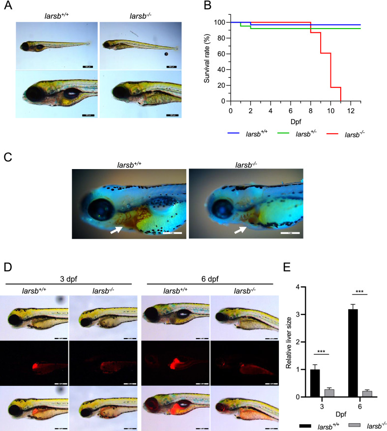 Leucyl-tRNA synthetase (LARS) is an enzyme that catalyses the ligation of leucine with leucine tRNA. LARS is also essential to sensitize the intracellular leucine concentration to the mammalian target of rapamycin complex 1 (mTORC1) activation. Biallelic mutation in the LARS gene causes infantile liver failure syndrome type 1 (ILFS1), which is characterized by acute liver failure, anaemia, and neurological disorders, including microcephaly and seizures. However, the molecular mechanism underlying ILFS1 under LARS deficiency has been elusive. Here, we generated Lars deficient (larsb-/-) zebrafish that showed progressive liver failure and anaemia, resulting in early lethality within 12 days post fertilization. The atg5-morpholino knockdown and bafilomycin treatment partially improved the size of the liver and survival rate in larsb-/- zebrafish. These findings indicate the involvement of autophagy in the pathogenesis of larsb-/- zebrafish. Indeed, excessive autophagy activation was observed in larsb-/- zebrafish. Therefore, our data clarify a mechanistic link between LARS and autophagy in vivo. Furthermore, autophagy regulation by LARS could lead to development of new therapeutics for IFLS1.