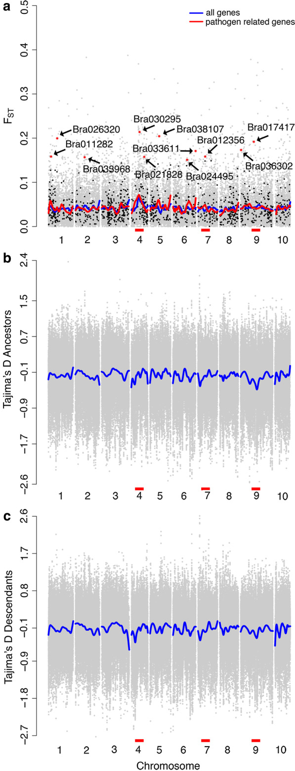 Results: Previously, we combined a resurrection experiment with genome-wide sequencing of 124 pooled ancestral and descendant plants. Here, using these previously generated sequence data (Franks et al. in Mol Ecol 25(15):3622-3631, 2016), we show that well-characterized necrotrophic fungal pathogen response (NFPR) genes have evolved, as indicated by changes in allele frequency, between ancestors and descendants, with several of them identified as extreme FST outliers. The jasmonic acid (JA) signaling pathway in particular seems to underlie the evolution of disease susceptibility, in addition to its well characterized role in plastic disease response. We identify a list of 260 genes that are both NFPR genes and are differentially expressed in response to drought, based on publicly available data. We present evidence that five of these genes evolved between ancestors and descendants, suggesting that the drought acted as the evolutionary driver, and that the accompanying increase in disease susceptibility may have been a consequence of genetic pleiotropy.