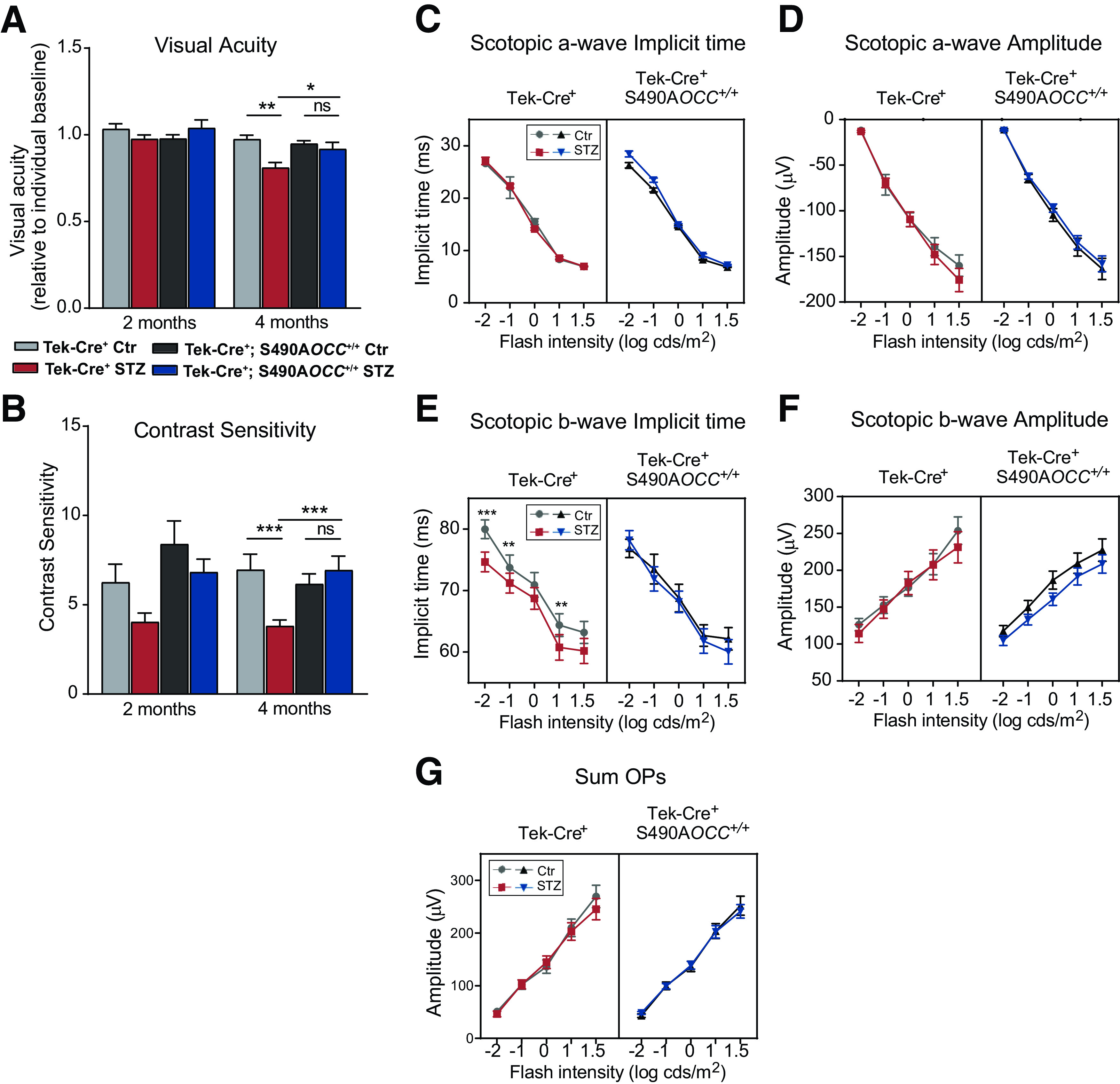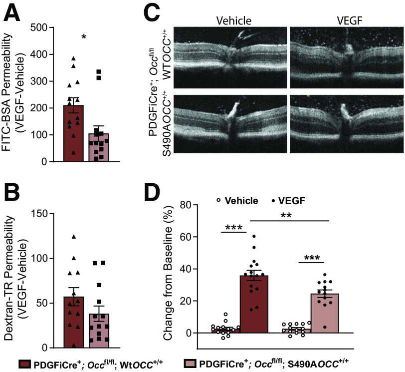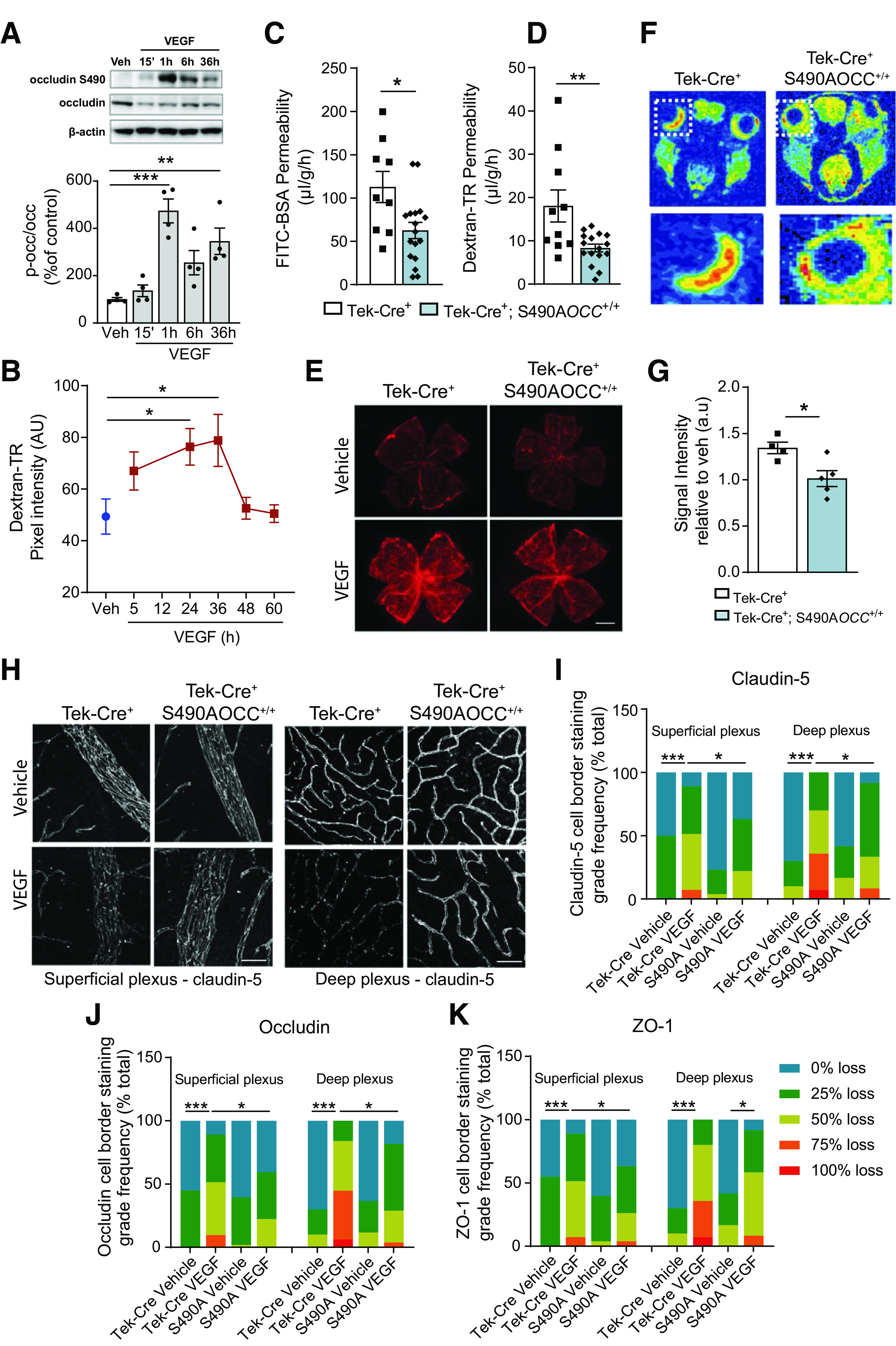Diabetic retinopathy is one of the leading causes of vision loss and blindness. Extensive preclinical and clinical evidence exists for both vascular and neuronal pathology. However, the relationship of these changes in the neurovascular unit and impact on vision remains to be determined. Here, we investigate the role of tight junction protein occludin phosphorylation at S490 in modulating barrier properties and its impact on visual function. Conditional vascular expression of the phosphorylation-resistant Ser490 to Ala (S490A) form of occludin preserved tight junction organization and reduced vascular endothelial growth factor (VEGF)-induced permeability and edema formation after intraocular injection. In the retinas of streptozotocin-induced diabetic mice, endothelial-specific expression of the S490A form of occludin completely prevented diabetes-induced permeability to labeled dextran and inhibited leukostasis. Importantly, vascular-specific expression of the occludin mutant completely blocked the diabetes-induced decrease in visual acuity and contrast sensitivity. Together, these results reveal that occludin acts to regulate barrier properties downstream of VEGF in a phosphorylation-dependent manner and that loss of inner blood-retinal barrier integrity induced by diabetes contributes to vision loss.