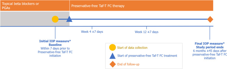 Methods: This observational, multicentre, European, prospective study recorded data during routine clinic appointments on the use of PF Taf-T FC for the treatment of OAG and ocular hypertension (OHT) in patients whose disease was insufficiently controlled on a prostaglandin analogue (PGA) or beta blocker monotherapy or who did not tolerate these medications. Mean change in IOP, symptom severity, changes in clinical signs, and tolerability were investigated over 6 months.