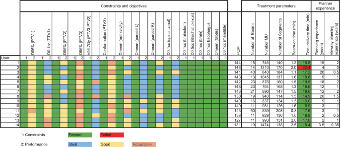Results: For most dose parameters the median score of all centers was higher than the threshold that results in an ideal score. Six participants achieved the maximum number of points for the OAR dose parameters, and none had an unacceptable performance on any of the metrics. Each planner was able to achieve all the requirements except for one which exceeded delivery time. The number of segments correlated to improved PQM and inversely correlated to brainstem D0.1cc and to Planning Target Volume1 (PTV) D0.1cc. Total planning experience inversely correlated to spinal canal dose.