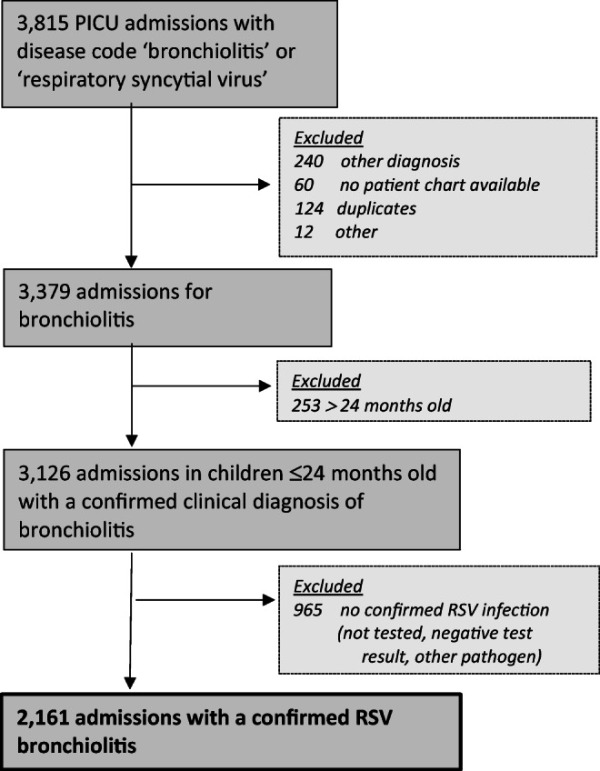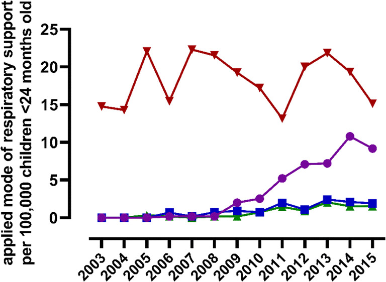 Respiratory syncytial virus (RSV) bronchiolitis causes substantial morbidity and mortality in young children, but insight into the burden of RSV bronchiolitis on pediatric intensive care units (PICUs) is limited. We aimed to determine the burden of RSV bronchiolitis on the PICUs in the Netherlands. Therefore, we identified all children ≤ 24 months of age with RSV bronchiolitis between 2003 and 2016 from a nationwide PICU registry. Subsequently we manually checked their patient records for correct diagnosis and collected patient characteristics, additional clinical data, respiratory support modes, and outcome. In total, 2161 children were admitted to the PICU for RSV bronchiolitis. The annual number of admissions increased significantly during the study period (β 4.05, SE 1.27, p = 0.01), and this increase was mostly driven by increased admissions in children up to 3 months old. Concomitantly, non-invasive respiratory support significantly increased (β 7.71, SE 0.92, p < 0.01), in particular the use of high flow nasal cannula (HFNC) (β 6.69, SE 0.96, p < 0.01), whereas the use of invasive ventilation remained stable.Conclusion: The burden of severe RSV bronchiolitis on PICUs has increased in the Netherlands. Concomitantly, the use of non-invasive respiratory support, especially HFNC, has increased. What is Known: • RSV bronchiolitis is a major cause of childhood morbidity and mortality and may require pediatric intensive care unit admission. • The field of pediatric critical care for severe bronchiolitis has changed due to increased non-invasive respiratory support options. What is New: • The burden of RSV bronchiolitis for the Dutch PICUs has increased. These data inform future strategic PICU resource planning and implementation of RSV preventive strategies. • There was a significant increase in the use of high flow nasal cannula at the PICU, but the use of invasive mechanical ventilation did not decrease.