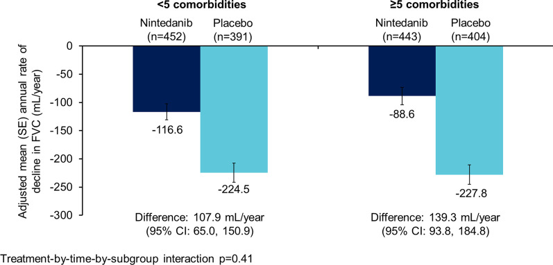 Results: The data set comprised 1690 patients. Nintedanib reduced the rate of decline in FVC (mL/year) over 52 weeks versus placebo in patients aged ≥ 75 years (difference: 105.3 [95% CI 39.3, 171.2]) (n = 326) and < 75 years (difference 125.2 [90.1, 160.4]) (n = 1364) (p = 0.60 for treatment-by-time-by-subgroup interaction), in patients with < 5 comorbidities (difference: 107.9 [95% CI 65.0, 150.9]) (n = 843) and ≥ 5 comorbidities (difference 139.3 [93.8, 184.8]) (n = 847) (p = 0.41 for treatment-by-time-by-subgroup interaction) and in patients with CCI score ≤ 3 (difference: 106.4 [95% CI 70.4, 142.4]) (n = 1330) and CCI score > 3 (difference: 129.5 [57.6, 201.4]) (n = 360) (p = 0.57 for treatment-by-time-by-subgroup interaction). The adverse event profile of nintedanib was generally similar across subgroups. The proportion of patients with adverse events leading to treatment discontinuation was greater in patients aged ≥ 75 years than < 75 years in both the nintedanib (26.4% versus 16.0%) and placebo (12.2% versus 10.8%) groups. Similarly the proportion of patients with adverse events leading to treatment discontinuation was greater in patients with ≥ 5 than < 5 comorbidities (nintedanib: 20.5% versus 15.7%; placebo: 12.1% versus 10.0%).