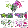 (A) Top and (B) side view of the SARS‐CoV‐2 spike protein (gray) in complex with the ACE2 receptor (yellow, orange, dark orange) (pdb code: 7KMS) superposed on the RBD:Nb complexes NM1226 (light green) and NM1230 (magenta). A close‐up view shown in black boxes elucidates how both Nbs block ACE2 receptor attachment.