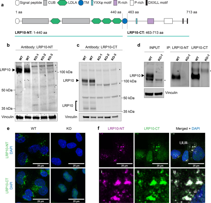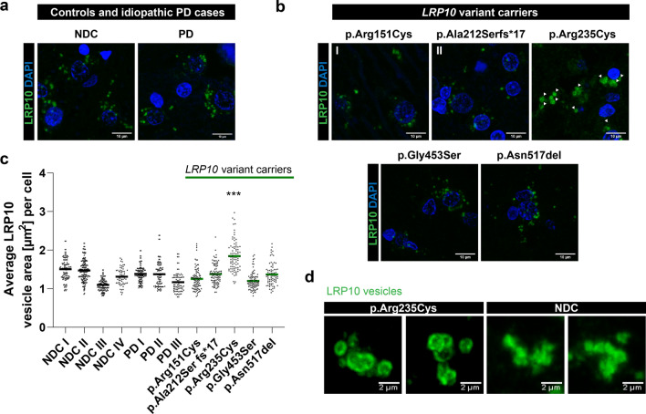 Loss-of-function variants in the low-density lipoprotein receptor-related protein 10 (LRP10) gene have been associated with autosomal-dominant Parkinson's disease (PD), PD dementia, and dementia with Lewy bodies (DLB). Moreover, LRP10 variants have been found in individuals diagnosed with progressive supranuclear palsy and amyotrophic lateral sclerosis. Despite this genetic evidence, little is known about the expression and function of LRP10 protein in the human brain under physiological or pathological conditions. To better understand how LRP10 variants lead to neurodegeneration, we first performed an in-depth characterisation of LRP10 expression in post-mortem brains and human-induced pluripotent stem cell (iPSC)-derived astrocytes and neurons from control subjects. In adult human brain, LRP10 is mainly expressed in astrocytes and neurovasculature but undetectable in neurons. Similarly, LRP10 is highly expressed in iPSC-derived astrocytes but cannot be observed in iPSC-derived neurons. In astrocytes, LRP10 is present at trans-Golgi network, plasma membrane, retromer, and early endosomes. Interestingly, LRP10 also partially co-localises and interacts with sortilin-related receptor 1 (SORL1). Furthermore, although LRP10 expression and localisation in the substantia nigra of most idiopathic PD and DLB patients and LRP10 variant carriers diagnosed with PD or DLB appeared unchanged compared to control subjects, significantly enlarged LRP10-positive vesicles were detected in a patient carrying the LRP10 p.Arg235Cys variant. Last, LRP10 was detected in Lewy bodies (LB) at late maturation stages in brains from idiopathic PD and DLB patients and in LRP10 variant carriers. In conclusion, high LRP10 expression in non-neuronal cells and undetectable levels in neurons of control subjects indicate that LRP10-mediated pathogenicity is initiated via cell non-autonomous mechanisms, potentially involving the interaction of LRP10 with SORL1 in vesicle trafficking pathways. Together with the specific pattern of LRP10 incorporation into mature LBs, these data support an important mechanistic role for disturbed vesicle trafficking and loss of LRP10 function in neurodegenerative diseases.