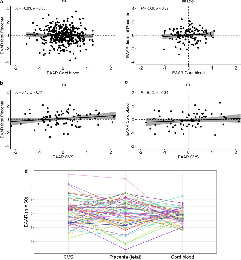 Conclusion: Gestational epigenetic age acceleration or deceleration was not related to more favorable or unfavorable factors in one direction in the investigated tissues, and the relative epigenetic age differed between tissues of the same person. This indicates that epigenetic age deviations associate with distinct, tissue specific, factors during the gestational and perinatal period. Our findings suggest that the epigenetic age of the newborn should be seen as a characteristic of a specific tissue, and less as a general characteristic of the child itself.