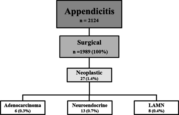 Keywords: Acute appendicitis; Acute care surgery; Adenocarcinoma; Emergency general surgery; Mucinous neoplasm; Neuroendocrine tumor.