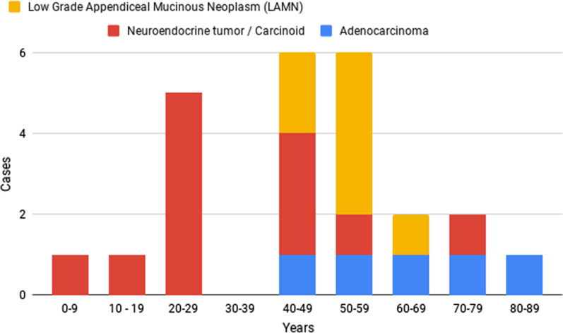Conclusions: Appendiceal adenocarcinomas were identified in patients with acute appendicitis that seem to be associated with increasing age. The presence of an appendiceal malignancy should be considered in the management of older patients with acute appendicitis before a decision to embark on non-operative therapy.