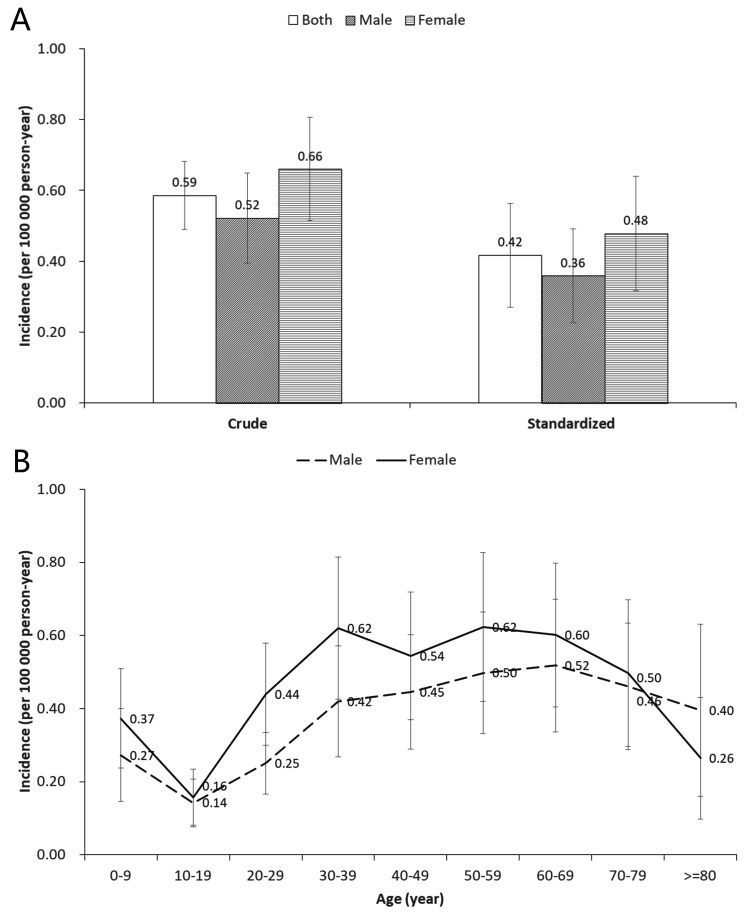 Results: A total of 1987 MMD patients (mean age 44.45±14.30 years, female-to-male ratio 1.12) were identified, representing a national crude incidence of 0.59 (95% CI: 0.49 to 0.68) and a prevalence of 1.01 (95% CI: 0.81 to 1.21) per 100 000 person-years in 2016. Rates were higher in females than in males for the incidence (0.66 vs 0.52) and prevalence (1.05 vs 0.90). And the age-specific rates showed a bimodal distribution, with the highest peak in middle-aged group and the second peak in child group.