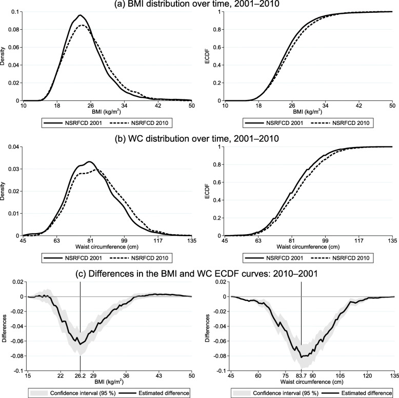 Results: Despite some relatively pronounced left-skewing, both the BMI and WC distributions exhibited a clear rightward shift to which the increases in general and central obesity can be mostly attributed. According to the Gini coefficients, both general and central obesity inequality increased over the 2001-2010 period, from 0.105 [95% confidence interval (CI) = 0.103-0.106] to 0.110 [95% CI = 0.107-0.112] and from 0.083 [95% CI = 0.082-0.084] to 0.085 [95% CI = 0.084-0.087], respectively. The GE-based decomposition further revealed that both types of inequality were accounted for primarily by within-group inequality (93.3%/89.6% and 87.5%/84.8% in 2001/2010 for general/central obesity, respectively).