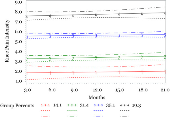 Results: Pain trajectories were relatively stable among a sample of adults with knee pain. Four distinct pain trajectories emerged in the overall sample, with the largest proportion of participants (35.1%) classified in the moderate-high pain group. There were significant relationships between age, education, income, ethnicity/race and trajectory group; with younger, less educated, lower income, and non-Hispanic Black participants had a greater representation in the highest pain trajectory group.