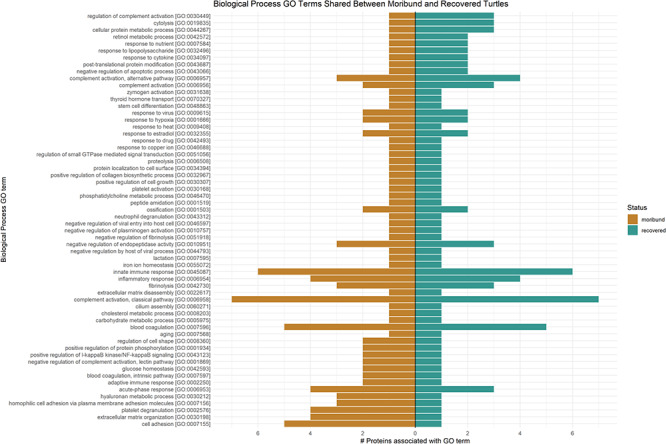 Evaluating sea turtle health can be challenging due to an incomplete understanding of pathophysiologic responses in these species. Proteome characterization of clinical plasma samples can provide insights into disease progression and prospective biomarker targets. A TMT-10-plex-LC-MS/MS platform was used to characterize the plasma proteome of five, juvenile, green turtles (Chelonia mydas) and compare qualitative and quantitative protein changes during moribund and recovered states. The 10 plasma samples yielded a total of 670 unique proteins. Using ≥1.2-fold change in protein abundance as a benchmark for physiologic upregulation or downregulation, 233 (34.8%) were differentially regulated in at least one turtle between moribund and recovered states. Forty-six proteins (6.9%) were differentially regulated in all five turtles with two proteins (0.3%) demonstrating a statistically significant change. A principle component analysis showed protein abundance loosely clustered between moribund samples or recovered samples and for turtles that presented with trauma (n = 3) or as intestinal floaters (n = 2). Gene Ontology terms demonstrated that moribund samples were represented by a higher number of proteins associated with blood coagulation, adaptive immune responses and acute phase response, while recovered turtle samples included a relatively higher number of proteins associated with metabolic processes and response to nutrients. Abundance levels of 48 proteins (7.2%) in moribund samples significantly correlated with total protein, albumin and/or globulin levels quantified by biochemical analysis. Differentially regulated proteins identified with immunologic and physiologic functions are discussed for their possible role in the green turtle pathophysiologic response and for their potential use as diagnostic biomarkers. These findings enhance our ability to interpret sea turtle health and further progress conservation, research and rehabilitation programs for these ecologically important species.