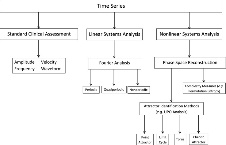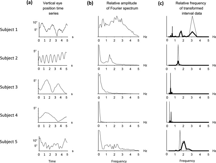 We present a new computational approach to analyse nystagmus waveforms. Our framework is designed to fully characterise the state of the nystagmus, aid clinical diagnosis and to quantify the dynamical changes in the oscillations over time. Both linear and nonlinear analyses of time series were used to determine the regularity and complexity of a specific homogenous phenotype of nystagmus. Two-dimensional binocular eye movement recordings were carried out on 5 adult subjects who exhibited a unilateral, uniplanar, vertical nystagmus secondary to a monocular late-onset severe visual loss in the oscillating eye (the Heimann-Bielschowsky Phenomenon). The non-affected eye held a central gaze in both horizontal and vertical planes (± 10 min. of arc). All affected eyes exhibited vertical oscillations, with mean amplitudes and frequencies ranging from 2.0°-4.0° to 0.25-1.5 Hz, respectively. Unstable periodic orbit analysis revealed only 1 subject exhibited a periodic oscillation. The remaining subjects were found to display quasiperiodic (n = 1) and nonperiodic (n = 3) oscillations. Phase space reconstruction allowed attractor identification and the computation of a time series complexity measure-the permutation entropy. The entropy measure was found to be able to distinguish between a periodic oscillation associated with a limit cycle attractor, a quasiperiodic oscillation associated with a torus attractor and nonperiodic oscillations associated with higher-dimensional attractors. Importantly, the permutation entropy was able to rank the oscillations, thereby providing an objective index of nystagmus complexity (range 0.15-0.21) that could not be obtained via unstable periodic orbit analysis or attractor identification alone. These results suggest that our framework provides a comprehensive methodology for characterising nystagmus, aiding differential diagnosis and also permitting investigation of the waveforms over time, thereby facilitating the quantification of future therapeutic managements. In addition, permutation entropy could provide an additional tool for future oculomotor modelling.