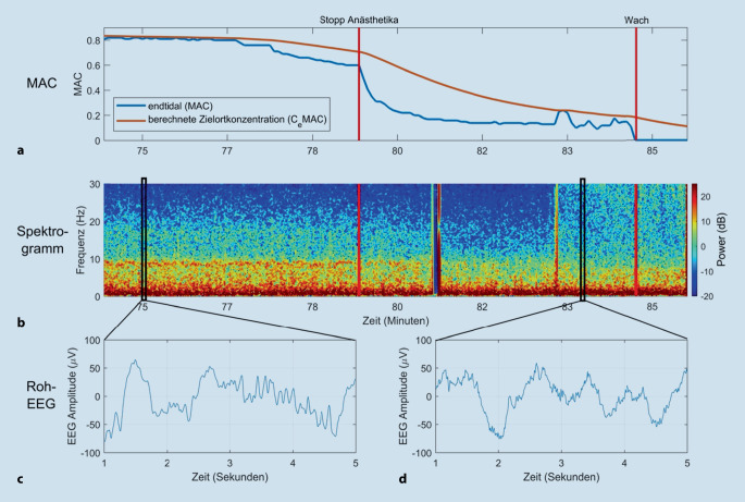 Das Elektroenzephalogramm (EEG) findet im klinischen Alltag der Anästhesie des deutschsprachigen Raumes zunehmend Anwendung. Bei über 90 % der Patienten ändert sich das frontale EEG als Reaktion auf die Gabe der gebräuchlichen Narkotika (Propofol und volatile Narkosegase) in typischer Weise. Eine adäquate Narkosetiefe und angemessene Konzentrationen der Anästhetika im Gehirn erzeugen meist frontale Oszillationen zwischen 8 und 12 Hz (α-Oszillationen) sowie langsame δ‑Wellen zwischen 0,5 und 4 Hz. Die frontale EEG-Ableitung eignet sich gut zur Vermeidung einer unzureichenden Narkosetiefe bzw. einer Überdosierung von Anästhetika. Im Folgenden werden die klinische Interpretation der wichtigsten EEG-Muster und ihr biophysikalischer Hintergrund erläutert. Ebenso werden wichtige Limitationen und „Fallstricke“ für den klinischen Alltag diskutiert, die der Anästhesist kennen sollte, um das EEG als zwar unvollständigen, aber klinisch äußerst wichtigen Parameter des Bewusstseinslevels zu nutzen.