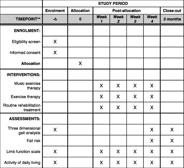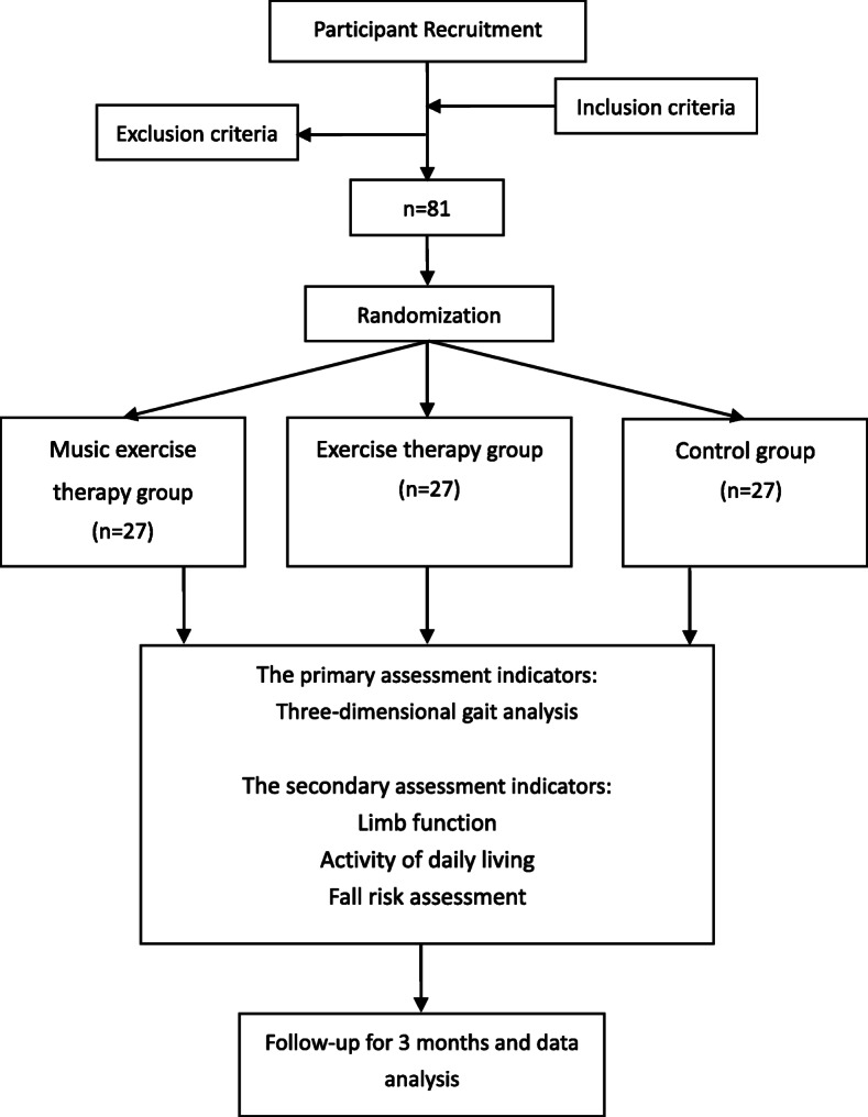 Methods/design: This three-arm randomized controlled trial will evaluate clinical efficacy of music exercise therapy in improving the freezing of gait in Parkinson's patients. We will recruit a total of 81 inpatients with Parkinson's disease, who meet the trial criteria. The patients will randomly receive music exercise with and without music as well as routine rehabilitation therapies, followed by analysis of changes in their gait and limb motor function after 4 weeks of intervention. We will first use a three-dimensional gait analysis system to evaluate changes in patients' gait, followed by assessment of their limb function, activity of daily living and fall risk.