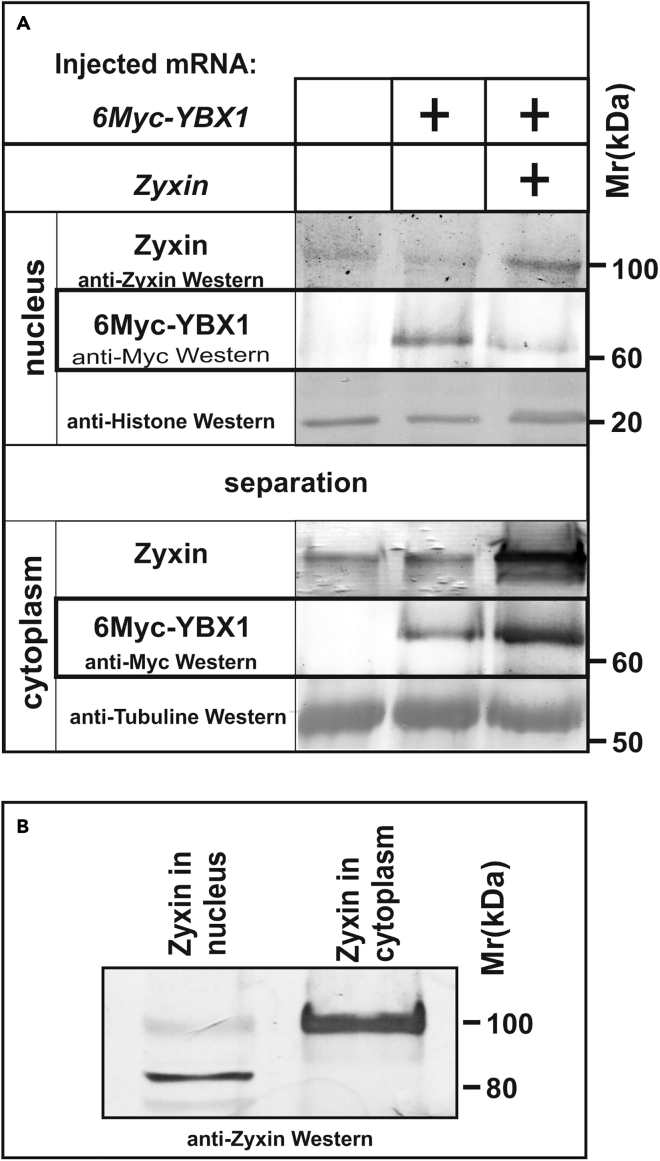 This protocol for the separation of nuclear and cytoplasmic fractions of cells of Xenopus laevis embryos was developed to study changes in the intracellular localization of the Zyxin and Ybx1 proteins, which are capable of changing localization in response to certain stimuli. Western blot analysis allows the quantification of changes in the distribution of these proteins between the cytoplasm and nucleus, whereas the posttranslational modifications specific to each compartment can be identified by changes in electrophoretic mobility. For complete details on the use and execution of this protocol, please refer to Parshina et al. (2020).