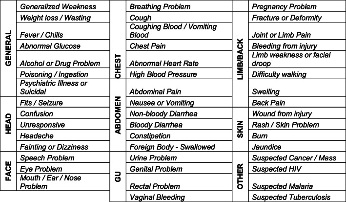 Conclusions: This study presented a systematic methodology for calibrating a chief complaint list for the local context. Our revised list removed/reworded symptoms that frequently clustered together or were misinterpreted by health professionals. Recommendations for additions, modifications, and/or deletions from the pilot chief complaint list we believe will improve the functionality of the list in low resource environments.