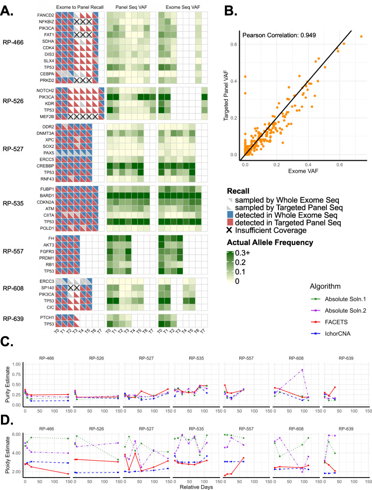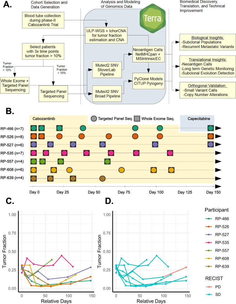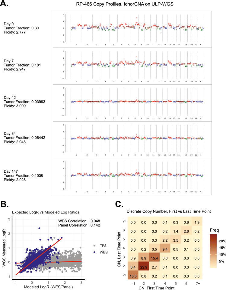 Methods: In this exploratory analysis, we characterize high-frequency ctDNA sample series collected over narrow time frames from seven patients with metastatic triple-negative breast cancer, each undergoing treatment with Cabozantinib, a multi-tyrosine kinase inhibitor (NCT01738438, https://clinicaltrials.gov/ct2/show/NCT01738438 ). Applying orthogonal whole exome sequencing, ultra-low pass whole genome sequencing, and 396-gene targeted panel sequencing, we analyzed 42 plasma-derived ctDNA libraries, representing 4-8 samples per patient with 6-42 days between samples. Integrating tumor fraction, copy number, and somatic variant information, we model tumor clonal dynamics, predict neoantigens, and evaluate consistency of genomic information from orthogonal assays.
