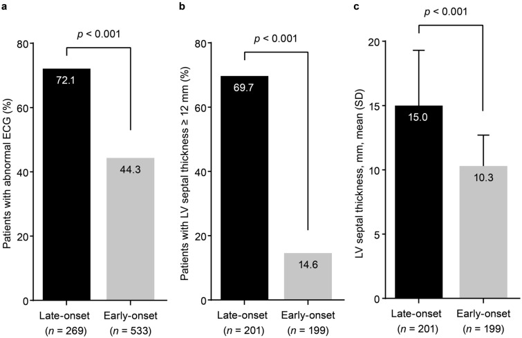 Results: Of 1389 patients with ATTRv Val30Met amyloidosis, 491 (35.3%) had late-onset disease. Compared with early-onset, patients with late-onset were more likely to be male (66.2% vs. 53.6%) and have a longer mean (standard deviation [SD]) time from onset to diagnosis (3.8 [3.4] vs. 2.7 [4.1] years). Late-onset disease was associated with more severe neurological impairment at enrollment (median [10th, 90th percentile] derived Neuropathy Impairment Score in the Lower Limbs, 25.0 [4.0, 69.3] vs. 8.0 [0, 54.8]; Neurologic Composite Score, 42.0 [2.0, 155.0] vs. 21.0 [0, 102.0]). Cardiac findings were more prominent in late-onset disease. An overall interpretation of electrocardiogram as abnormal was reported in 72.1% of late-onset patients (vs. 44.3% early-onset). A left-ventricular septal thickness of at least 12 mm was reported in 69.7% of late-onset patients (vs. 14.6% early-onset). All differences were statistically significant (p < 0.001).