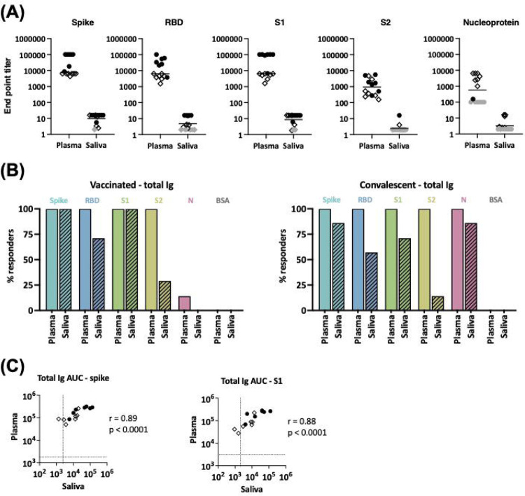 Antibodies (Abs) are essential for the host immune response against SARS-CoV-2, and all the vaccines developed so far have been designed to induce Abs targeting the SARS-CoV-2 spike. Many studies have examined Ab responses in the blood from vaccinated and infected individuals. However, since SARS-CoV-2 is a respiratory virus, it is also critical to understand the mucosal Ab responses at the sites of initial virus exposure. Here, we examined plasma versus saliva Ab responses in vaccinated and convalescent patients. Although saliva levels were significantly lower, a strong correlation was observed between plasma and saliva total Ig levels against all SARS-CoV-2 antigens tested. Virus-specific IgG1 responses predominated in both saliva and plasma, while a lower prevalence of IgM and IgA1 Abs was observed in saliva. Antiviral activities of plasma Abs were also studied. Neutralization titers against the initial WA1 (D614G), B.1.1.7 (alpha) and B.1.617.2 (delta) strains were similar but lower against the B.1.351 (beta) strain. Spike-specific antibody-dependent cellular phagocytosis (ADCP) activities were also detected and the levels correlated with spike-binding Ig titers. Interestingly, while neutralization and ADCP potencies of vaccinated and convalescent groups were comparable, enhanced complement deposition to spike-specific Abs was noted in vaccinated versus convalescent groups and corresponded with higher levels of IgG1 plus IgG3 among the vaccinated individuals. Altogether, this study demonstrates the detection of Ab responses after vaccination or infection in plasma and saliva that correlate significantly, although Ig isotypic differences were noted. The induced plasma Abs displayed Fab-mediated and Fc-dependent functions with comparable neutralization and ADCP potencies, but a greater capacity to activate complement was elicited upon vaccination.