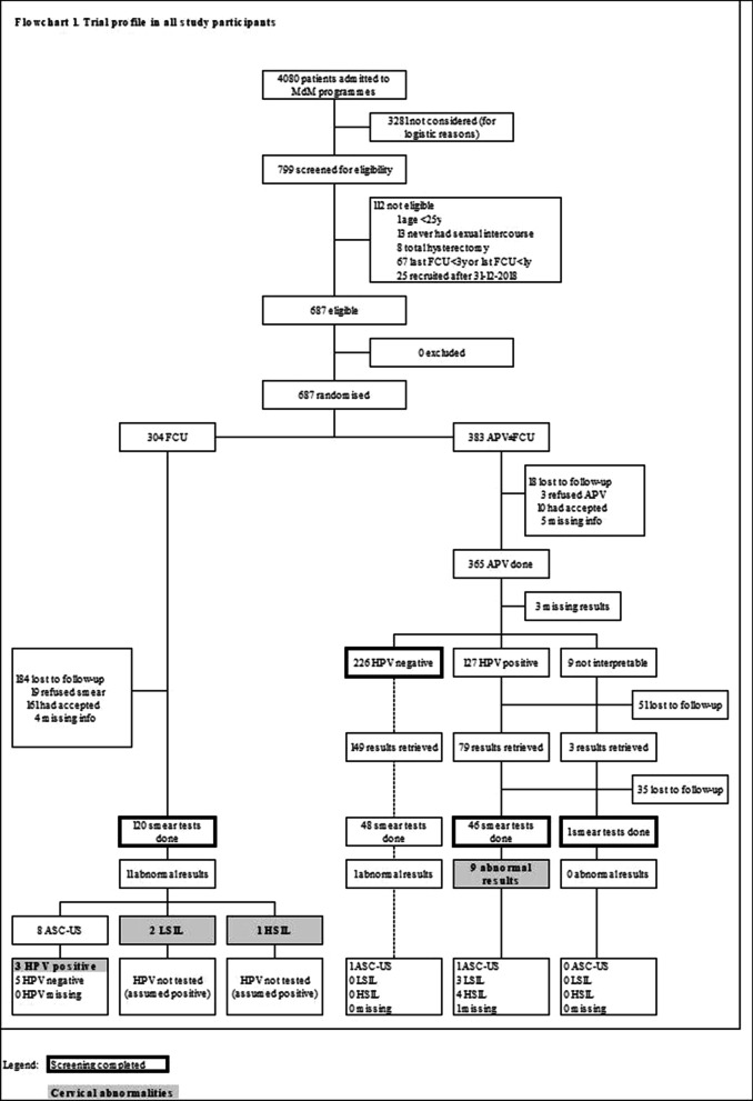 Results: 383 women were assigned to the EG and 304 to the CG. The screening completion proportion was 39.5% in the CG compared to 71.3% in the EG (HR = 2.48 (CI 95% [1.99-3.08]; p < 0.001). The proportion of cytological abnormalities was 2.0% in the CG and 2.3% in the EG (OR = 1.20 (CI 95% [0.42-3.40]; p = 0.7). The proportion of participants lost to follow-up was 60.5% in the CG and 63.2% in the EG HPV positive (p = 0.18).