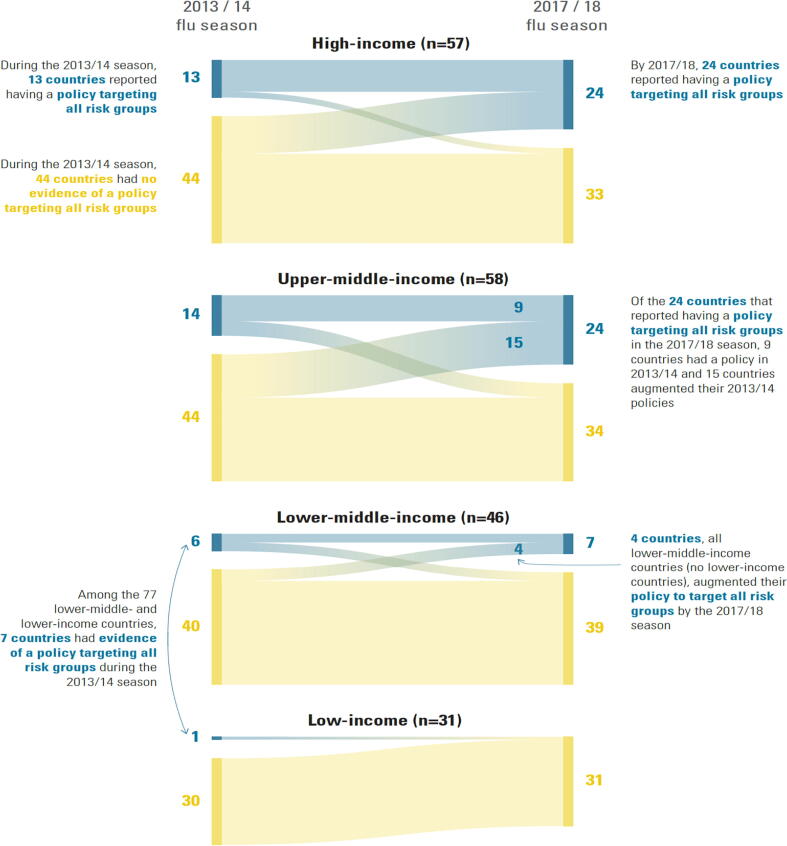 Methods: We utilized EXCEL and STATA to evaluate changes to national seasonal influenza vaccination policies reported on the WHO/UNICEF Joint Reporting Forms on Immunization (JRF) in 2014 and 2018. To characterize countries with or without policies, we incorporated external data on World Bank income groupings, WHO regions, and immunization system strength (using 3 proxy indicators).