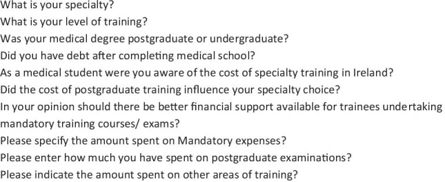 Introduction: Postgraduate specialty training in Ireland is associated with considerable cost. Some of these are mandatory costs such as medical council fees, while others are necessary to ensure career progression, such as attendance at courses and conferences. In particular, surgical specialities are believed to be associated with high training costs. It is unknown how these costs compare to those borne by counterparts in other specialities.