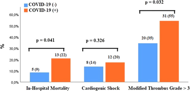 Results: There was a 30.5% drop in STEMI admission during COVID-19 era in comparison to pre-COVID-19 era. The patients admitted to the medical centers during COVID-19 era had a longer symptom-to-first medical contact time [120 (75-240) vs. 100 (60-180) minutes, p < 0.001]. COVID-19 positive STEMI patients had higher thrombus grade and lower left ventricular ejection fraction compared to COVID-19 negative patients. COVID-19 positive patients had higher mortality (28% vs. 6%, p < 0.001) and cardiogenic shock (20% vs. 7%, p < 0.001) rates compared with those without COVID-19. Matching based on propensity scores showed higher mortality and high thrombus grade in STEMI patients who were infected by SARS-COV-2 (each p < 0.05).