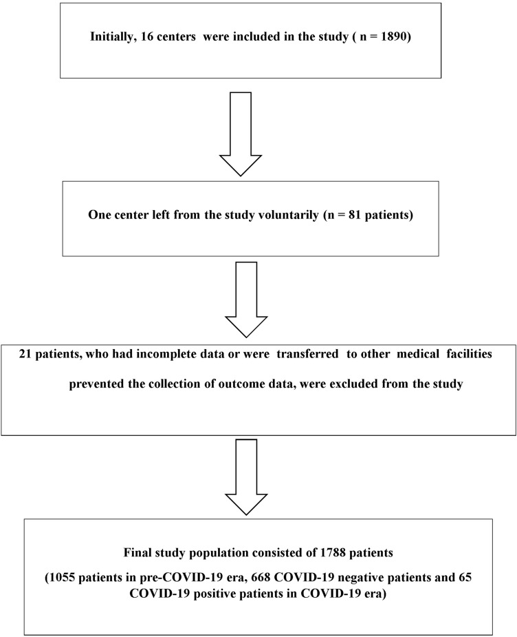 Methods: This was a multi-center and cross-sectional observational study. The study population included 1788 STEMI patients from 15 centers in Turkey. The patients were divided into two groups: COVID-19 era (March 11st-May 15st, 2020; n = 733) or pre- COVID-19 era group (March 11st-May 15st, 2019; n = 1055). Also, the patients in COVID-19 era were grouped as COVID-19 positive (n = 65) or negative (n = 668).