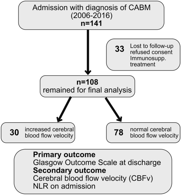 In community-acquired bacterial meningitis (CABM) intracranial vascular alterations are devastating complications which are triggered by neuroinflammation and result in worse clinical outcome. The Neutrophil-to-Lymphocyte ratio (NLR) represents a reliable parameter of the inflammatory response. In this study we analyzed the association between NLR and elevated cerebral blood flow velocity (CBFv) in CABM-patients. This study included all (CABM)-patients admitted to a German tertiary center between 2006 and 2016. Patients' demographics, in-hospital measures, neuroradiological data and clinical outcome were retrieved from institutional databases. CBFv was assessed by transcranial doppler (TCD). Patients', radiological and laboratory characteristics were compared between patients with/without elevated CBFv. Multivariate-analysis investigated parameters independently associated with elevated CBFv. Receiver operating characteristic(ROC-)curve analysis was undertaken to identify the best cut-off for NLR to discriminate between increased CBFv. 108 patients with CABM were identified. 27.8% (30/108) showed elevated CBFv. Patients with elevated CBFv and normal CBFv, respectively had a worse clinical status on admission (Glasgow Coma Scale: 12 [9-14] vs. 14 [11-15]; p = 0.005) and required more often intensive care (30/30 [100.0%] vs. 63/78 [80.8%]; p = 0.01).The causative pathogen was S. pneumoniae in 70%. Patients with elevated CBFv developed more often cerebrovascular complications with delayed cerebral ischemia (DCI) within hospital stay (p = 0.031). A significantly higher admission-NLR was observed in patients with elevated CBFv (median [IQR]: elevated CBFv:24.0 [20.4-30.2] vs. normal CBFv:13.5 [8.4-19.5]; p < 0.001). Multivariate analysis, revealed NLR to be significantly associated with increased CBFv (Odds ratio [95%CI] 1.042 [1.003-1.084]; p = 0.036). ROC-analysis identified a NLR of 20.9 as best cut-off value to discriminate between elevated CBFv (AUC = 0.713, p < 0.0001, Youden's Index = 0.441;elevated CBFv: NLR ≥ 20.9 19/30[63.5%] vs. normal CBFv: NLR > 20.9 15/78[19.2%]; p < 0.001). Intracranial vascular complications are common among CABM-patients and are a risk factor for unfavorable outcome at discharge. Elevated NLR is independently associated with high CBFv and may be useful in predicting patients' prognosis.