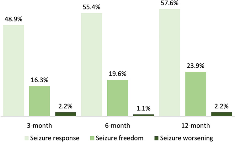 Methods: Older (≥ 65 years of age) patients prescribed add-on perampanel at 12 Italian epilepsy centers were retrospectively identified. Seizure occurrence, adverse events (AEs), and drug withdrawal were analyzed. Effectiveness outcomes included the rates of seizure response (≥ 50% reduction in baseline monthly seizure frequency), seizure freedom, and treatment discontinuation. Safety and tolerability outcomes were the rate of treatment discontinuation due to AEs and the incidence of AEs.
