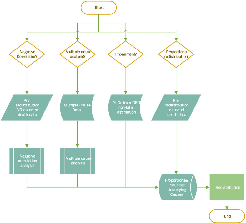 Methods: We describe the methods developed for the GBD 2019 study and subsequent iterations to redistribute garbage-coded deaths in vital registration data to plausible underlying causes. These methods include analysis of multiple cause data, negative correlation, impairment, and proportional redistribution. We classify garbage codes into classes according to the level of specificity of the reported cause of death (CoD) and capture trends in the global pattern of proportion of garbage-coded deaths, disaggregated by these classes, and the relationship between this proportion and the Socio-Demographic Index. We examine the relative importance of the top four garbage codes by age and sex and demonstrate the impact of redistribution on the annual GBD CoD rankings.