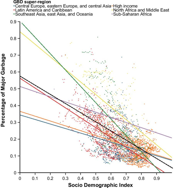 Results: The proportion of least-specific (class 1 and 2) garbage-coded deaths ranged from 3.7% of all vital registration deaths to 67.3% in 2015, and the age-standardized proportion had an overall negative association with the Socio-Demographic Index. When broken down by age and sex, the category for unspecified lower respiratory infections was responsible for nearly 30% of garbage-coded deaths in those under 1 year of age for both sexes, representing the largest proportion of garbage codes for that age group. We show how the cause distribution by number of deaths changes before and after redistribution for four countries: Brazil, the United States, Japan, and France, highlighting the necessity of accounting for garbage-coded deaths in the GBD.