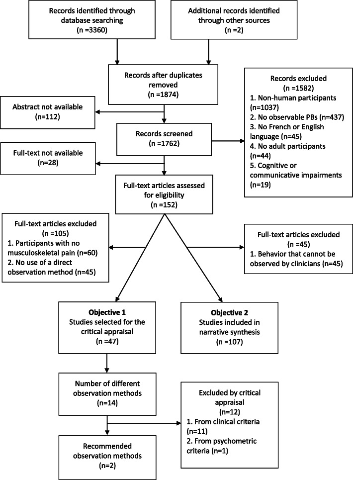 Results: From the 3362 retrieved studies, 47 met the inclusion criteria for the first objective. The clinical criteria allowed us to select three observation methods. After the psychometric step, two observation methods were retained and recommended for clinical practice: the Behavioral Avoidance Test-Back Pain (BAT-Back) and the Pain Behaviour Scale (PaBS). For the second objective, 107 studies met the inclusion criteria. The extraction of the PB allowed us to list a large range of PB and classify the data in 7 categories of PB.