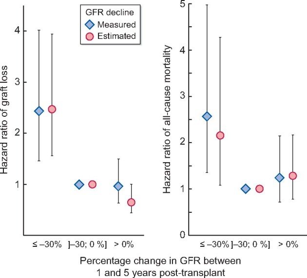 Methods: We retrospectively analysed all recipients transplanted between 1989 and 2000 in our centre, with inulin-measured and Chronic Kidney Disease Epidemiology Collaboration (CKD-EPI)-estimated GFR at 1 and 5 years post-transplant, and evaluated the performance [time-dependent area under the receiver operating characteristic curve (ROC AUC) and subdistribution hazard ratio (sdHR) with competing risk model] of GFR change to predict graft failure and all-cause mortality.