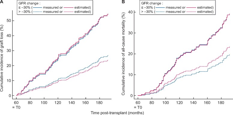 Results: Out of 417 kidney transplant recipients, 116 patients had lost their graft and 77 had died 16 years after transplantation. While being significantly associated with graft failure [sdHR = 2.37 (95% confidence interval 1.47-3.83)], CKD-EPI-GFR decline ≥30% failed to appropriately predict long-term graft survival (C-statistics of 0.63). Concordance between inulin-GFR and CKD-EPI-GFR to detect similar GFR change was only 53%. Inulin-GFR change was, however, not a better predictor (C-statistics of 0.59). Comparable results were observed for mortality.