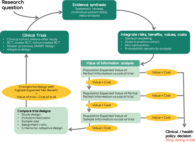 Clinical trials require participation of numerous patients, enormous research resources and substantial public funding. Time-consuming trials lead to delayed implementation of beneficial interventions and to reduced benefit to patients. This manuscript discusses two methods for the allocation of research resources and reviews a framework for prioritisation and design of clinical trials. The traditional error-driven approach of clinical trial design controls for type I and II errors. However, controlling for those statistical errors has limited relevance to policy makers. Therefore, this error-driven approach can be inefficient, waste research resources and lead to research with limited impact on daily practice. The novel value-driven approach assesses the currently available evidence and focuses on designing clinical trials that directly inform policy and treatment decisions. Estimating the net value of collecting further information, prior to undertaking a trial, informs a decision maker whether a clinical or health policy decision can be made with current information or if collection of extra evidence is justified. Additionally, estimating the net value of new information guides study design, data collection choices, and sample size estimation. The value-driven approach ensures the efficient use of research resources, reduces unnecessary burden to trial participants, and accelerates implementation of beneficial healthcare interventions.