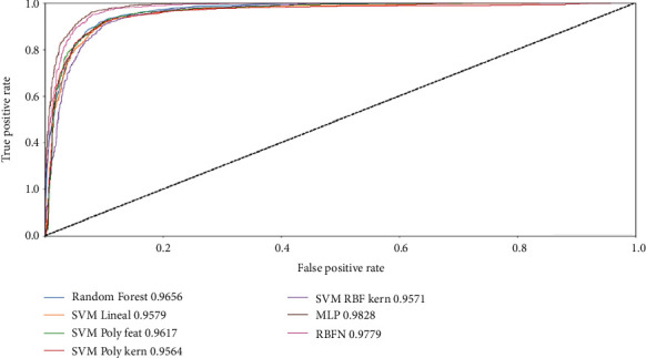 ROC curve. Dotted line from bottom left to upper right represents a strictly random classifier.
