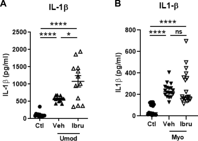 Recent studies suggested that ibrutinib, a Bruton tyrosine kinase (BTK) inhibitor, developed for the treatment of chronic lymphocytic leukemia, may prevent NLRP3 inflammasome activation in macrophages, IL-1β secretion and subsequent development of inflammation and organ fibrosis. The role of NLRP3 has been underlined in the various causes of acute kidney injury (AKI), a pathology characterized by high morbimortality and risk of transition toward chronic kidney disease (CKD). We therefore hypothesized that the BTK-inhibitor ibrutinib could be a candidate drug for AKI treatment. Here, we observed in both an AKI model (glycerol-induced rhabdomyolysis) and a model of rapidly progressive kidney fibrosis (unilateral ureteral obstruction), that ibrutinib did not prevent inflammatory cell recruitment in the kidney and fibrosis. Moreover, ibrutinib pre-exposure led to high mortality rate owing to severer rhabdomyolysis and AKI. In vitro, ibrutinib potentiated or had no effect on the secretion of IL-1β by monocytes exposed to uromodulin or myoglobin, two danger-associated molecule patterns proteins involved in the AKI to CKD transition. According to these results, ibrutinib should not be considered a candidate drug for patients developing AKI.