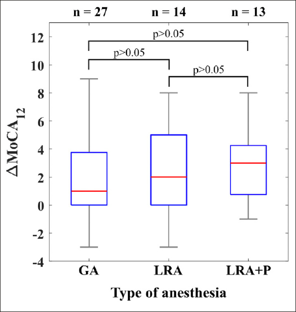 Results: Post-operative (D+2) MoCA scores were significantly lower than pre-operative ones (D-1) with a median difference of 2 pts [IQR]=4pts, (p<0.001), we found no significant difference between locoregional and general anesthesia. Pre-operative benzodiazepine or anticholinergic treatments were also associated to a drop in MoCA scores (p=0.006). Finally, the use of ketamine during anesthesia (p=0.043) and the well-being (p=0.006) evaluated before intervention, were both linked to a reduced cognitive impact.
