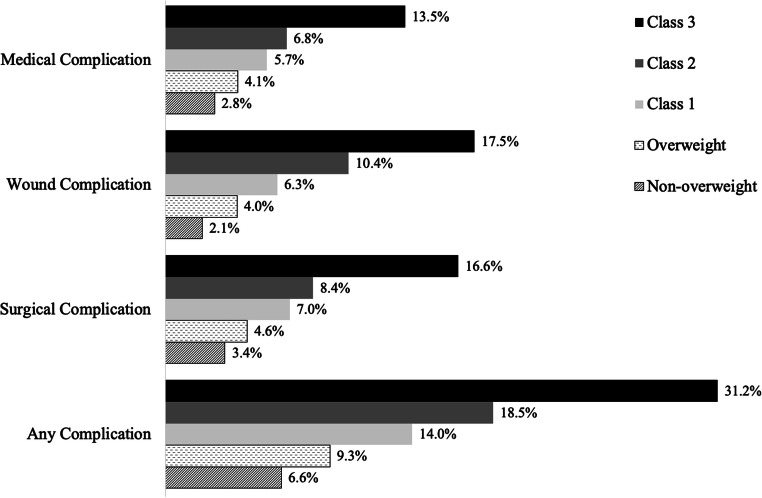 Results: Twelve thousand seven hundred thirty-two cases were analyzed, of which 1759 (13.8%) had at least one postoperative complication. As BMI increased, patients were more likely to experience postoperative complications (p<0.001). Patients experiencing complications were more likely to be male, older, of a higher BMI group, have a higher American Society of Anesthesiologists Personal Status classification, be an inpatient, have various comorbidities, or be undergoing a concurrent procedure. On multivariable analysis, patients who were overweight (OR=1.24, p=0.039), with class 1 (OR=1.72, p<0.001), class 2 (OR=2.10, p<0.001), or class 3 (OR=3.01, p<0.001) obesity were more likely to have a postoperative complication. Wound complications were particularly prevalent in patients who were overweight (OR=1.77, p=0.001) or with class 1 (OR=2.59, p<0.001), class 2 (OR=4.05, p<0.001), or class 3 (p=5.84, p<0.001) obesity compared to non-overweight patients.