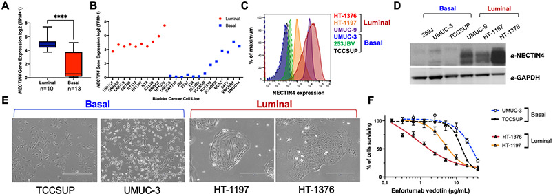 Results: NECTIN4 expression is heterogenous across molecular subtypes of bladder cancer and significantly enriched in luminal subtypes. NECTIN4 expression is positively correlated with luminal markers GATA3, FOXA1, and PPARG across all cohorts. NECTIN4 expression is both necessary and sufficient for EV sensitivity in luminal and basal subtypes of urothelial bladder cancer cells. Downregulation of NECTIN4 leads to EV resistance.