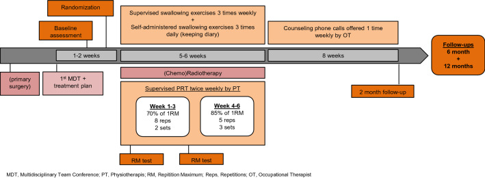 The diagnosis and treatment of head and neck cancer (HNC) can have substantial impact on swallowing function, nutritional balance, physical function and quality of life (QoL). Early initiated swallowing exercises are hypothesized to improve swallowing function in HNC patients. The aim was to investigate the effects of swallowing exercises and progressive resistance training (PRT) during radiotherapy on swallowing function, physical function and QoL in patients with pharynx-, larynx-, oral cavity cancer or unknown primary compared to usual care. In a multi-centre RCT participants were assigned to (a) twice-weekly PRT and daily swallowing exercises throughout treatment or (b) usual care. Outcomes were measured at end of treatment and 2, 6 and 12 months after. Primary outcome was penetration aspiration score (PAS). Data were analysed on an "intention-to-treat" basis by GEE logistic regression model, linear mixed effects model and cox regression. Of 371 invited HNC patients, 240 (65%) enrolled. Five participants were excluded. At 12 months follow-up, 59 (25%) participants were lost. Analyses showed significant effect on mouth opening, QoL, depression and anxiety at 12 months when comparing intervention to non-active controls. The trial found no effect on swallowing safety in HNC undergoing radiotherapy, but several positive effects were found on secondary outcomes when comparing to non-active controls. The intervention period may have been too short, and the real difference between groups is too small. Nevertheless, the need to identify long-lasting intervention to slow down or avoid functional deteriorations is ever more crucial as the surviving HNC population is growing.