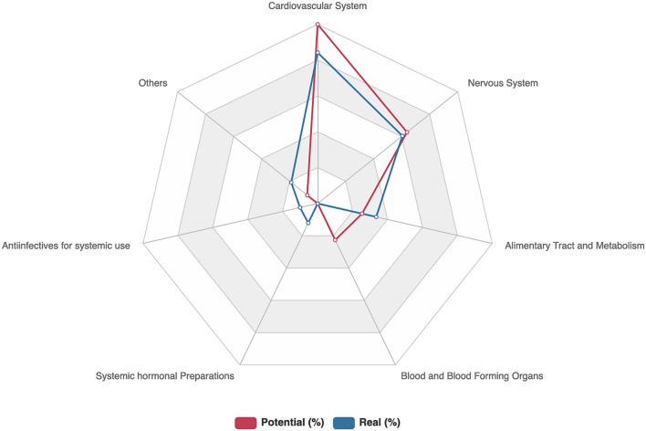 Primary aim was to assess prevalence and severity of potential and real drug-drug interactions (DDIs) among therapies for COVID-19 and concomitant medications in hospitalized patients with confirmed SARS-CoV-2 infection. The secondary aim was to analyze factors associated with rDDIs. An observational single center cohort study conducted at a tertiary hospital in Spain from March 1st to April 30th. rDDIs refer to interaction with concomitant drugs prescribed during hospital stay whereas potential DDIs (pDDIs) refer to those with domiciliary medication. DDIs checked with The University of Liverpool resource. Concomitant medications were categorized according to the Anatomical Therapeutic Chemical classification system. Binomial logistic regression was carried out to identify factors associated with rDDIs. A total of 174 patients were analyzed. DDIs were detected in 152 patients (87.4%) with a total of 417 rDDIs between COVID19-related drugs and involved hospital concomitant medication (60 different drugs) while pDDIs were detected in 105 patients (72.9%) with a total of 553 pDDIs. From all 417 rDDIs, 43.2% (n = 180) were associated with lopinavir/ritonavir and 52.9% (n = 221) with hydroxychloroquine, both of them the most prescribed (106 and 165 patients, respectively). The main mechanism of interaction observed was QTc prolongation. Clinically relevant rDDIs were identified among 81.1% (n = 338) ('potential interactions') and 14.6% (n = 61) (contraindicated) of the patients. Charlson index (OR 1.34, 95% IC 1.02-1.76) and number of drugs prescribed during admission (OR 1.42, 95% IC 1.12-1.81) were independently associated with rDDIs. Prevalence of patients with real and pDDIs was high, especially those clinically relevant. Both comorbidities and polypharmacy were found as risk factors independently associated with DDIs development.