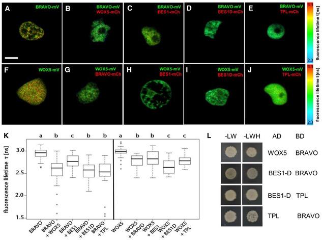 Interaction of BRAVO with WOX5 (B), BES1 (C), BES1‐D (D) and TPL (E); and interaction of WOX5 with BRAVO (G), BES1 (H), BES1‐D (I) and TPL (J) measured by FRET‐FLIM. GFP fluorescence lifetime τ [ns] was measured in transiently expressing Nicotiana benthamiana leaf epidermal cells. GFP fluorescence lifetime fitted pixel‐wise with a mono‐exponential model of BRAVO and WOX5 interactions. mV, mVenus; mCh, mCherry. Scale bar: 5 µm.
