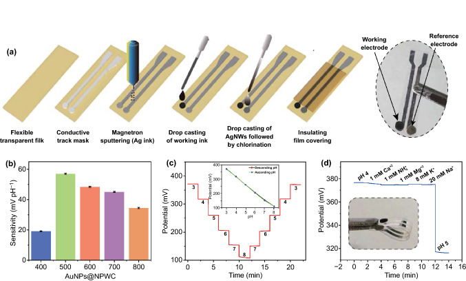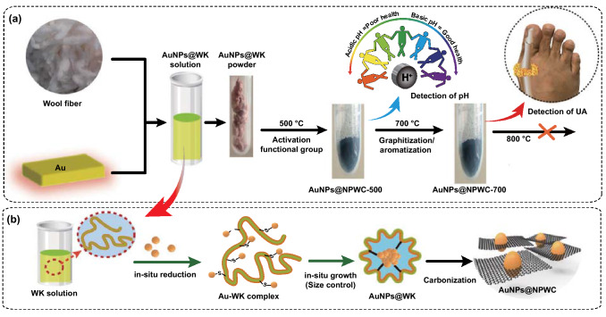 Flexible biosensors with high accuracy and reliable operation in detecting pH and uric acid levels in body fluids are fabricated using well-engineered metal-doped porous carbon as electrode material. The gold nanoparticles@N-doped carbon in situ are prepared using wool keratin as both a novel carbon precursor and a stabilizer. The conducting electrode material is fabricated at 500 °C under customized parameters, which mimics A-B type (two different repeating units) polymeric material and displays excellent deprotonation performance (pH sensitivity). The obtained pH sensor exhibits high pH sensitivity of 57 mV/pH unit and insignificant relative standard deviation of 0.088%. Conversely, the composite carbon material with sp2 structure prepared at 700 °C is doped with nitrogen and gold nanoparticles, which exhibits good conductivity and electrocatalytic activity for uric acid oxidation. The uric acid sensor has linear response over a range of 1-150 µM and a limit of detection 0.1 µM. These results will provide new avenues where biological material will be the best start, which can be useful to target contradictory applications through molecular engineering at mesoscale.