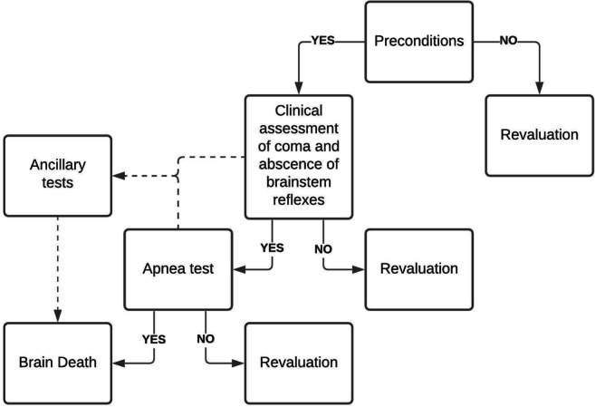 One of the first attempts to define brain death (BD) dates from 1963, and since then, the diagnosis criteria of that entity have evolved. In spite of the publication of practice parameters and evidence-based guidelines, BD is still causing concern and controversies in the society. The difficulties in determining brain death and making it understood by family members not only endorse futile therapies and increase health care costs, but also hinder the organ transplantation process. This review aims to give an overview about the definition of BD, causes, physiopathology, diagnosis criteria, and management of the potential brain-dead donor. It is important to note that the BD determination criteria detailed here follow the AAN's recommendations, but the standard practice for BD diagnosis varies from one country to another.