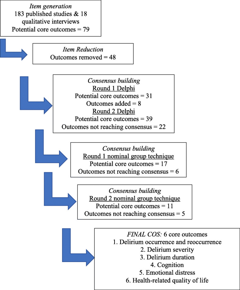 Methods: A rigorous COS development process was used including a systematic review, qualitative interviews, modified Delphi consensus process, and in-person consensus using nominal group technique (registration http://www.comet - initiative.org/studies/details/796 ). Participants in qualitative interviews were delirium survivors or family members. Participants in consensus methods comprised international representatives from three stakeholder groups: researchers, clinicians, and delirium survivors and family members.