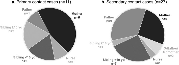 Results: A total of 247 infants and 130 contact cases were enrolled. Pertussis diagnosis result was obtained for 199 infants and 104 contact cases. Infant population was mostly < 3 months old (79.9%; 157/199) and unvaccinated (62.3%; 124/199), 20.1% (40/199) of them were confirmed having B. pertussis infection. Greater cough duration and lymphocyte counts were the only symptoms associated to positivity. Half of the contact cases (51.0%; 53/104) had a B. pertussis infection, median age was 31 years old. A proportion of 28.3% (15/53) positive contacts did not report any symptom. However, 67.9% (36/53) and 3.8% (2/53) of them reported cough at inclusion or during the study, including 20.8% (11/53) who started coughing ≥7 days before infant cough onset. Overall, only five samples were successfully cultured.